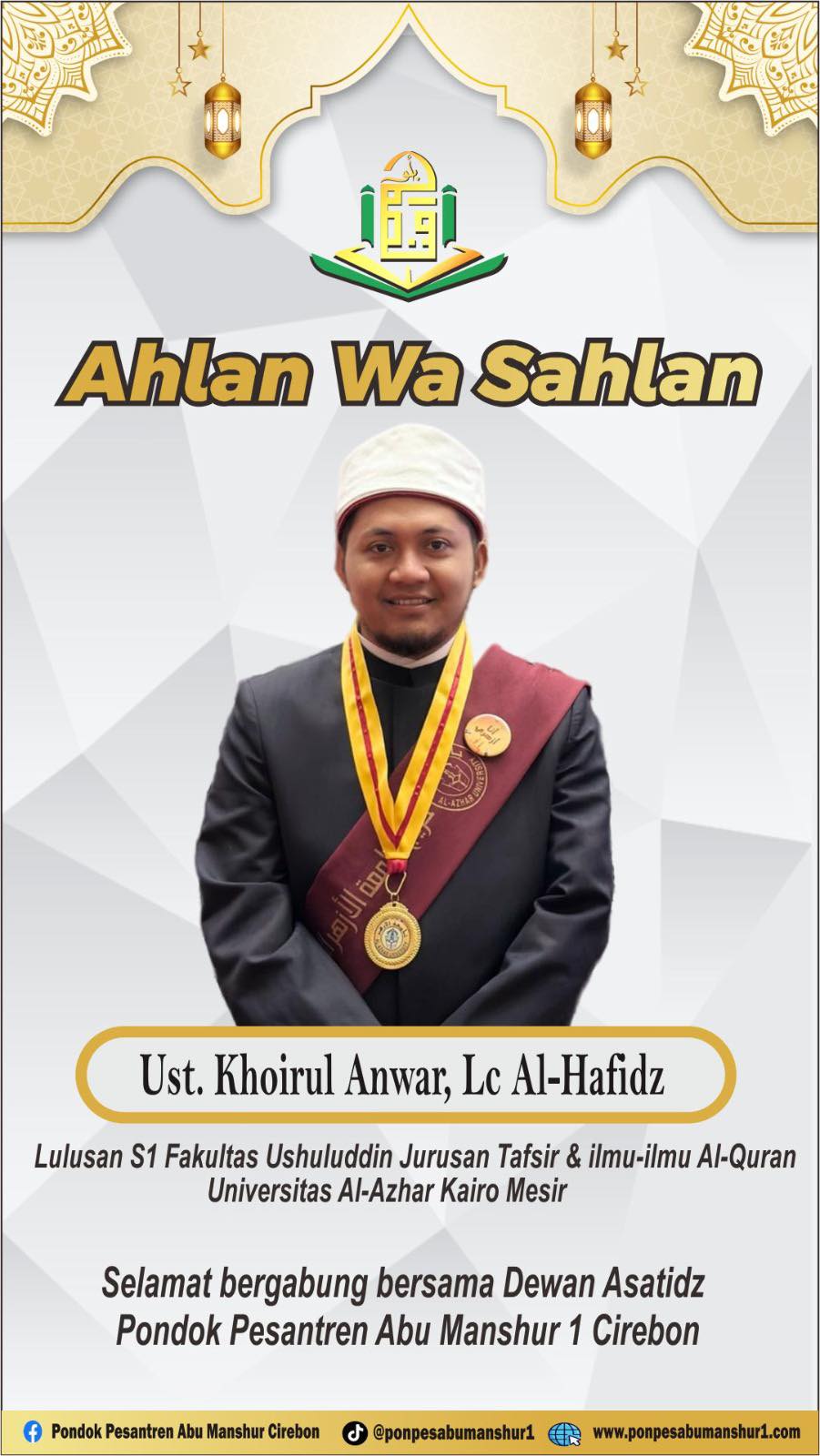 Selamat Bergabung Ust. Khoirul Anwar, Lc Al Hafidz (Alumni Universitas Al Azhar Mesir) menjadi Pengajar & Pendidik santri di Ponpes Abu Manshur 1.